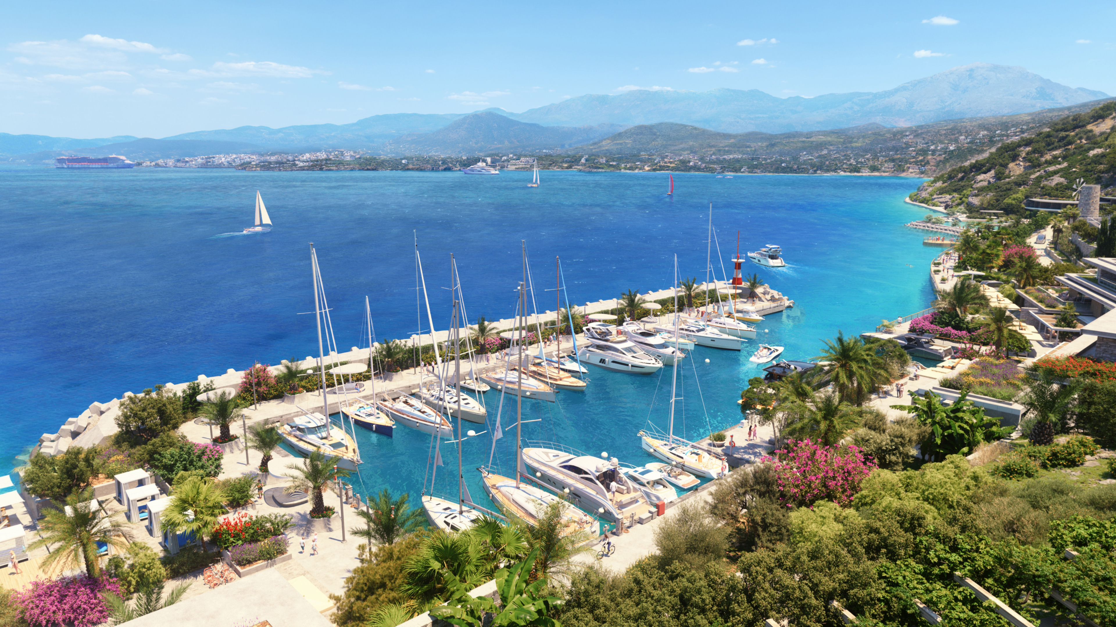 Elounda Hills offers a wide range of leisure amenities, to which residents enjoy privileged access. These include the marina, seafront promenade, beach clubs, amphitheater, botanical gardens, 2,000 sq m Bamford spa & wellness village, tennis and water sports centers, Kids and Teens clubs, chapel, retail zone, and workspace.